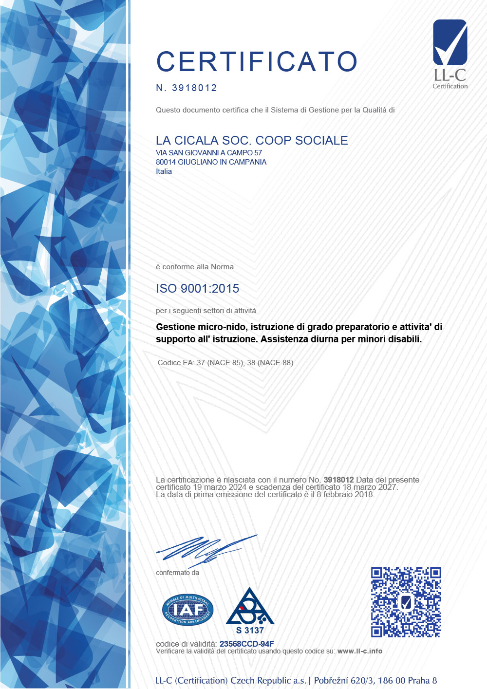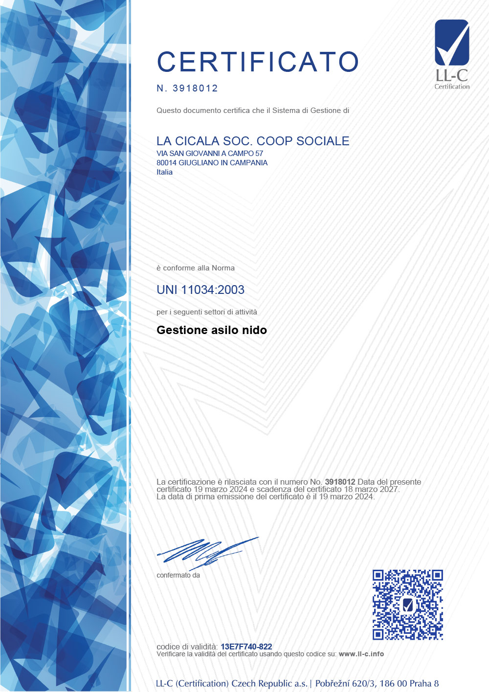 Certificato per la conformita alla norma 11034:2003 per la Gestione Asili Nido.